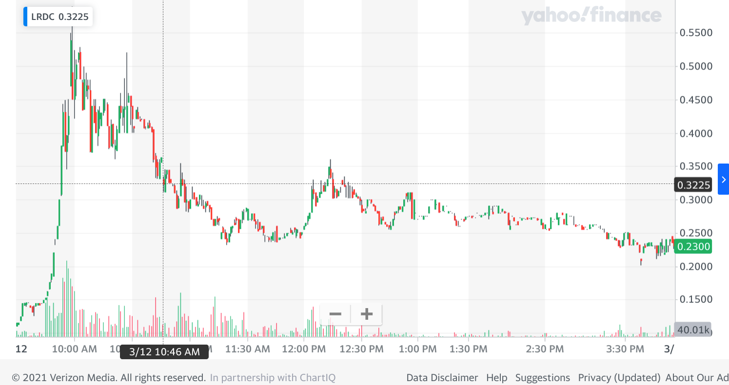 LRDC: My last trade of the week and it was an adrenaline rush. Got to watch this stock start to skyrocket in the last 10 minutes of the first hour of the market open on 3/12. I tried to gain an entry twice but my order was not filled. Instead of continuing the chase like I did with MDMP, I decided to sit back and wait for a dip. I missed the first bounce so I sat back and waited again. It started to drop to the .30’s and hovered around .34. I thought maybe it would start to bounce back so I put it in my limit order and it was filled at .34. Over the next several minutes, it kept going up and down 2% from my entry point. For a minute, I thought I was going to have to cut my losses at around 3%, and then Tim made a large purchase of the stock. I decided to place a sell limit order at .3445 and waited. I am just speculating here, but I think Tim’s purchase pushed the stock enough for me to reach my sell order but not enough from his purchase and others buying the dip to push it higher as it then dropped back down and stayed around the high .20’s before I had to log off. Came out with a gain of 1.68% WOOHOO! I don’t care how low it is, it’s the start of new habits. Verified trade here: https://profit.ly/1N4Ao1