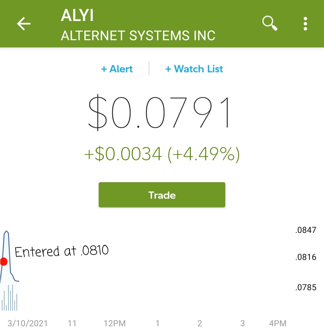 ALYI: When I looked at this stock on the morning of 3/10 it was starting to climb and I got in at a great entry point of .0810 as it was spiking. In less than 5 mins the spike was over and it sunk below my entry point. When it was up 5% and starting to turn, I should have followed the rules and cut losses quickly. It was a quick buy and sell but not nearly quick enough if I actually want to make it in penny stocks. Took a loss of -22.22%. Looking back at the chart, it actually sank more over the next few hours while I was at work so had I decided not to cut that loss and just ride it, I would have been kicking myself even more. Verified trade here: https://profit.ly/1N4AnN